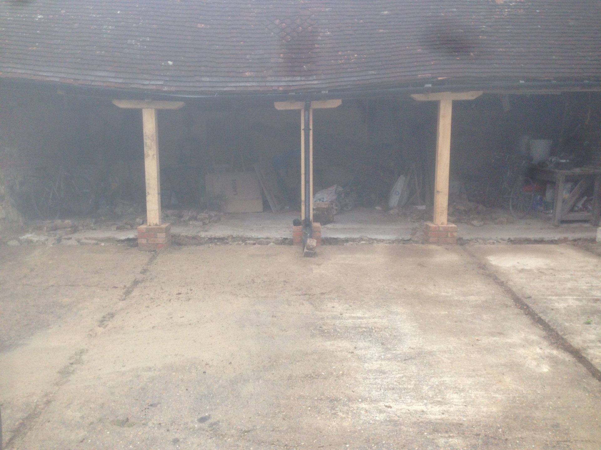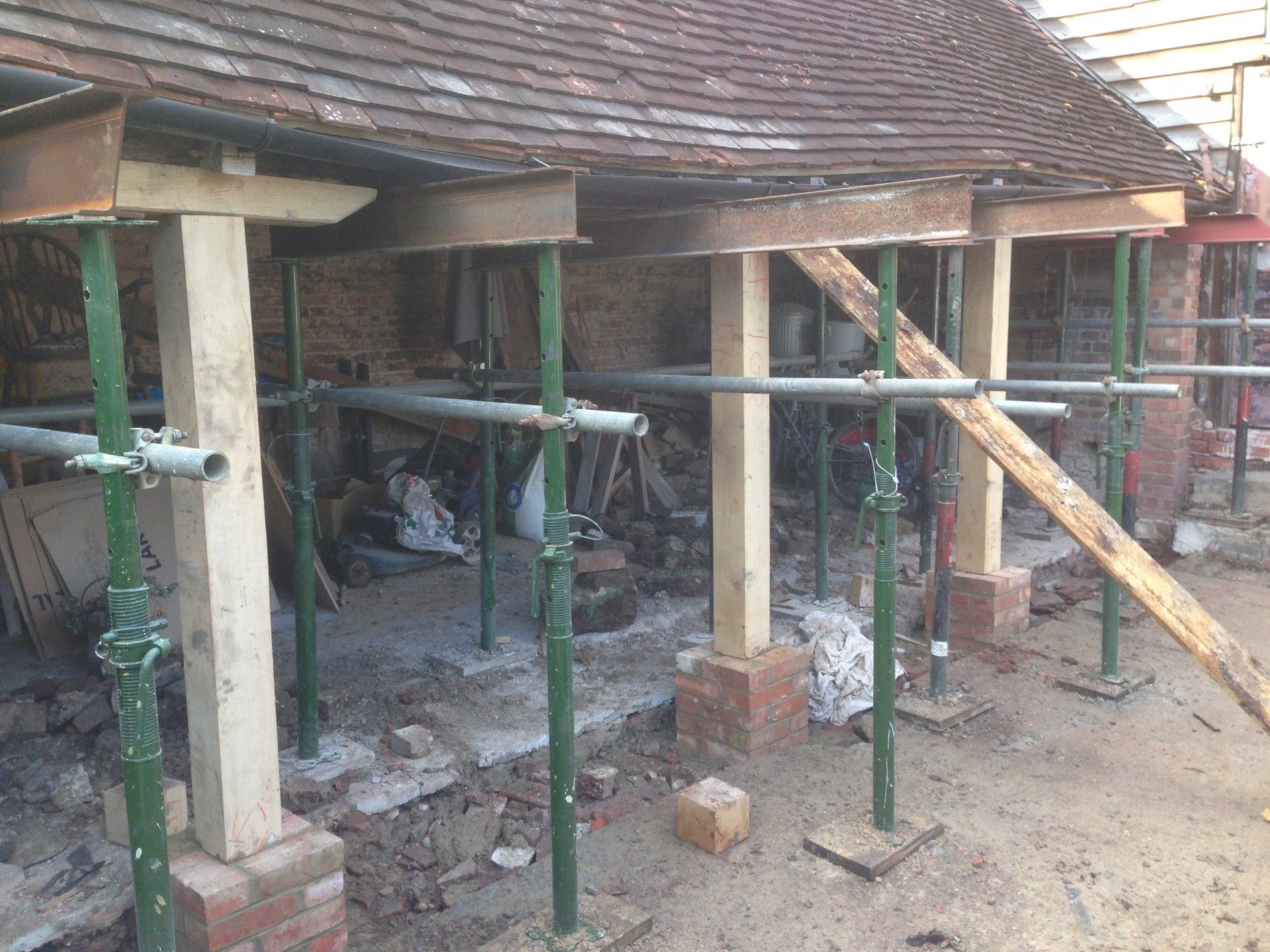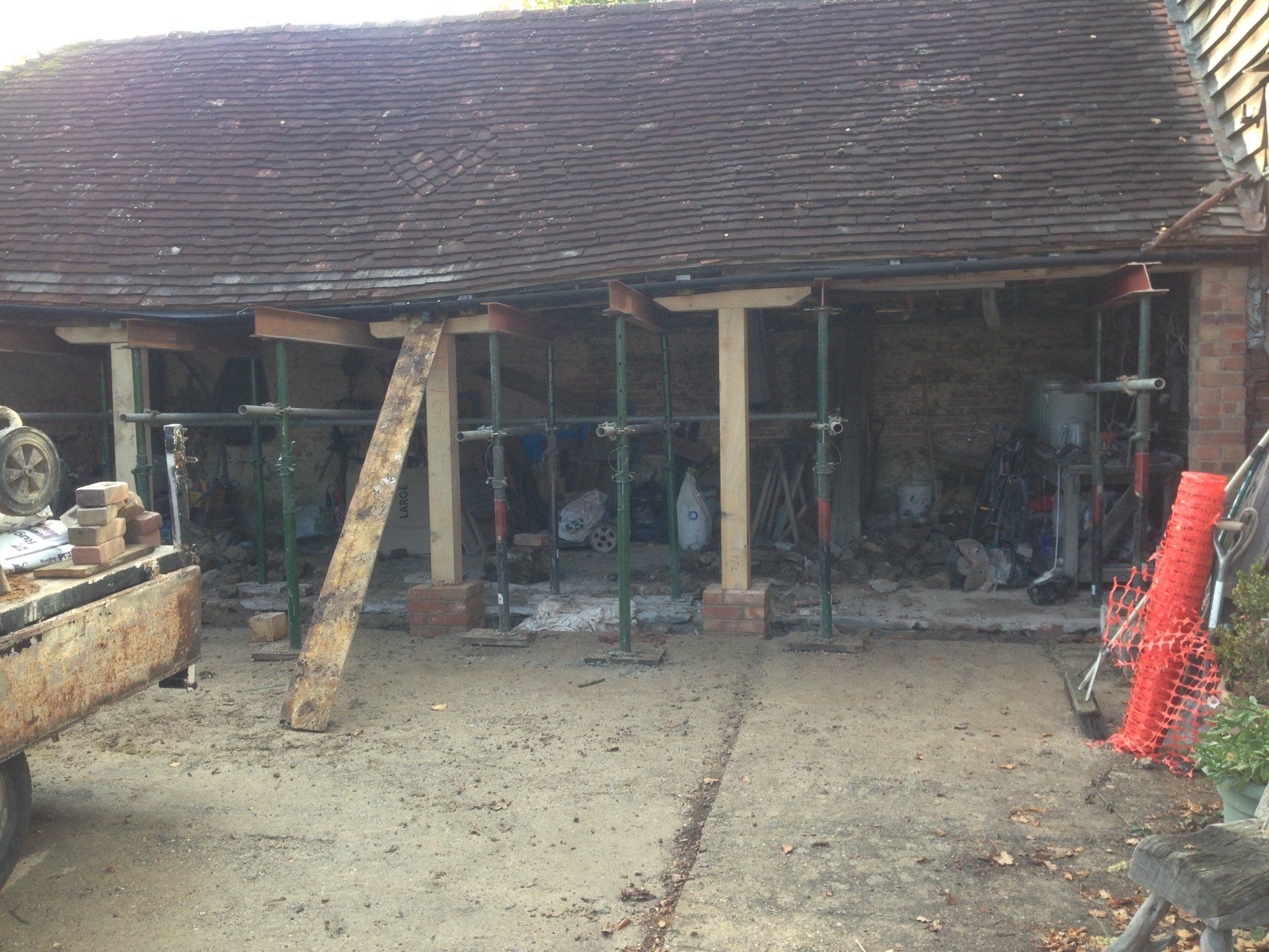 This project near Horam, East Sussex, which forms the first part of a barn conversion, required the temporary propping of the unstable roof structure, new foundation, new Brickwork plinths and Oak posts.